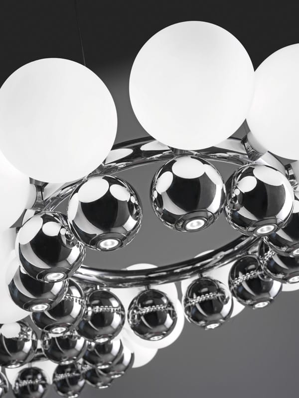 Owe 12 szklanych kloszy to tylko połowa pereł w kolii lampy 24PEARLS. Drugą dwunastkę uzupełniają podwieszone pod spodem chromowane kule o średnicy 8 cm. Żyrandol bez wątpienia powinien trafić do dużych salonów, przestronnych holi, hotelowych recepcji czy sal restauracyjnych urządzonych w subtelnie klasycznym lub nowoczesnym stylu. Pewne jest, że nie powinien oświetlać eleganckich, hotelowych basenów, bo z uwagi na poziom szczelności IP20 nie nadaje się do pomieszczeń o dużej wilgotności.