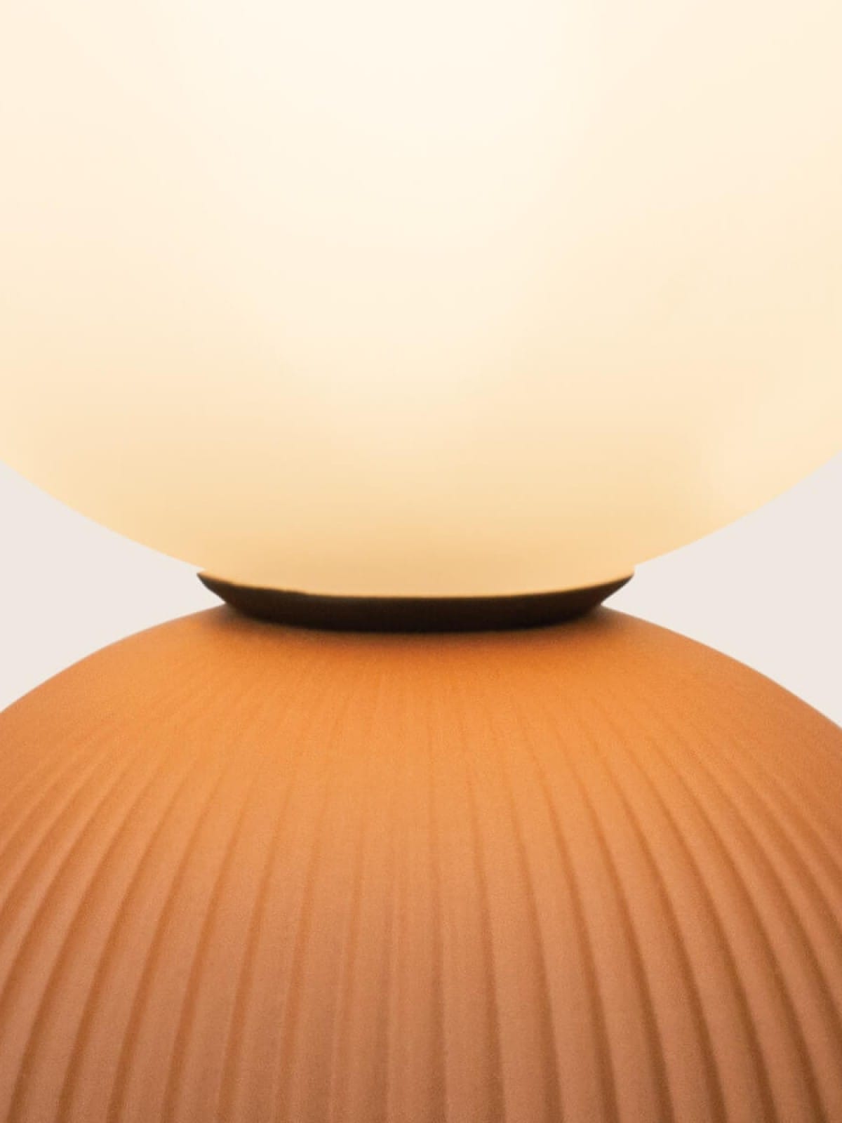 Lampy stołowe 2589 i 2590 to wyrafinowane, dekoracyjne, przenośne lampy stołowe, które wnoszą ciepło i autentyczność do każdego wnętrza. Wykonane z naturalnej gliny terakotowej, charakteryzują się unikalną ryflowaną fakturą, które dodają głębi i charakteru. Ta bogata, przyjemna w dotyku powierzchnia pięknie kontrastuje z gładkim, opalowym szkłem, tworząc harmonijną równowagę materiałów. Elegancki, piaskowo-czarny, metaliczny pierścień elegancko podkreśla połączenie glinianej podstawy ze szkłem, podkreślając kunszt wykonania. Lampy 2589 i 2590 to kwintesencja stylu i kunsztu wykonania.