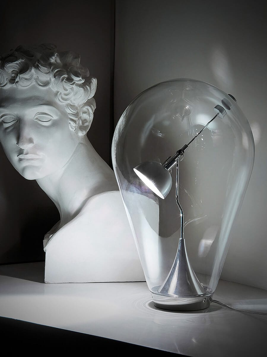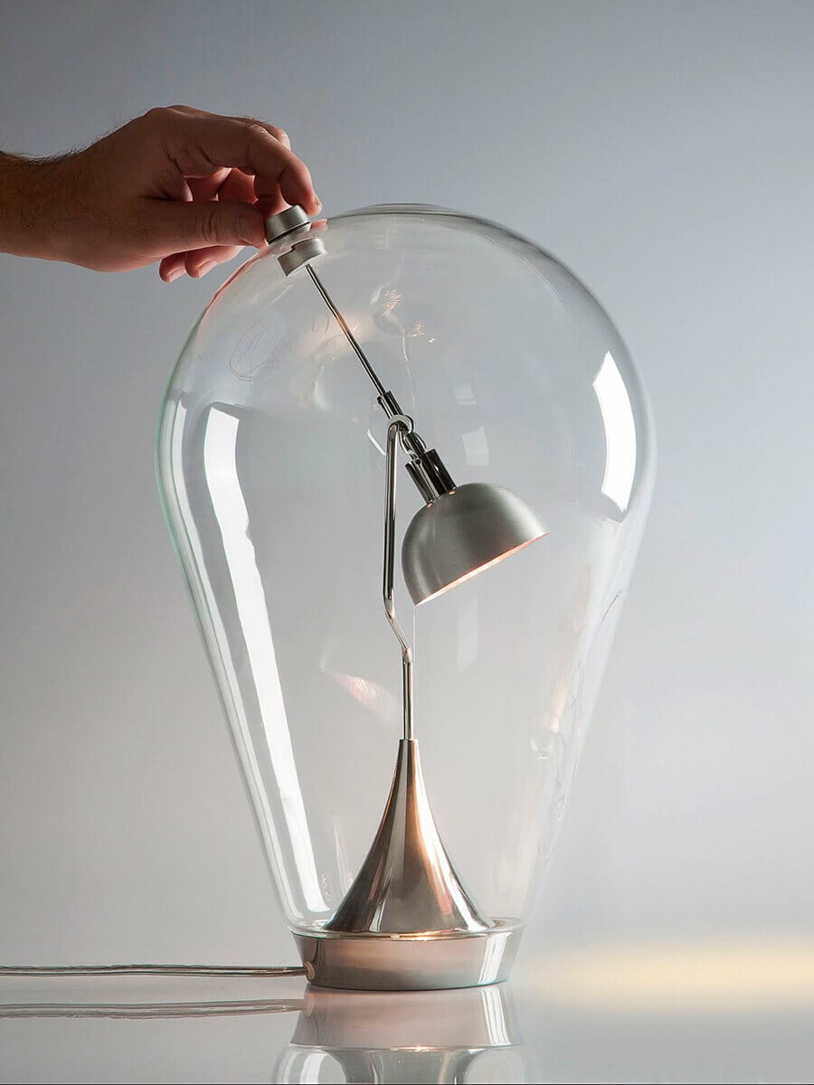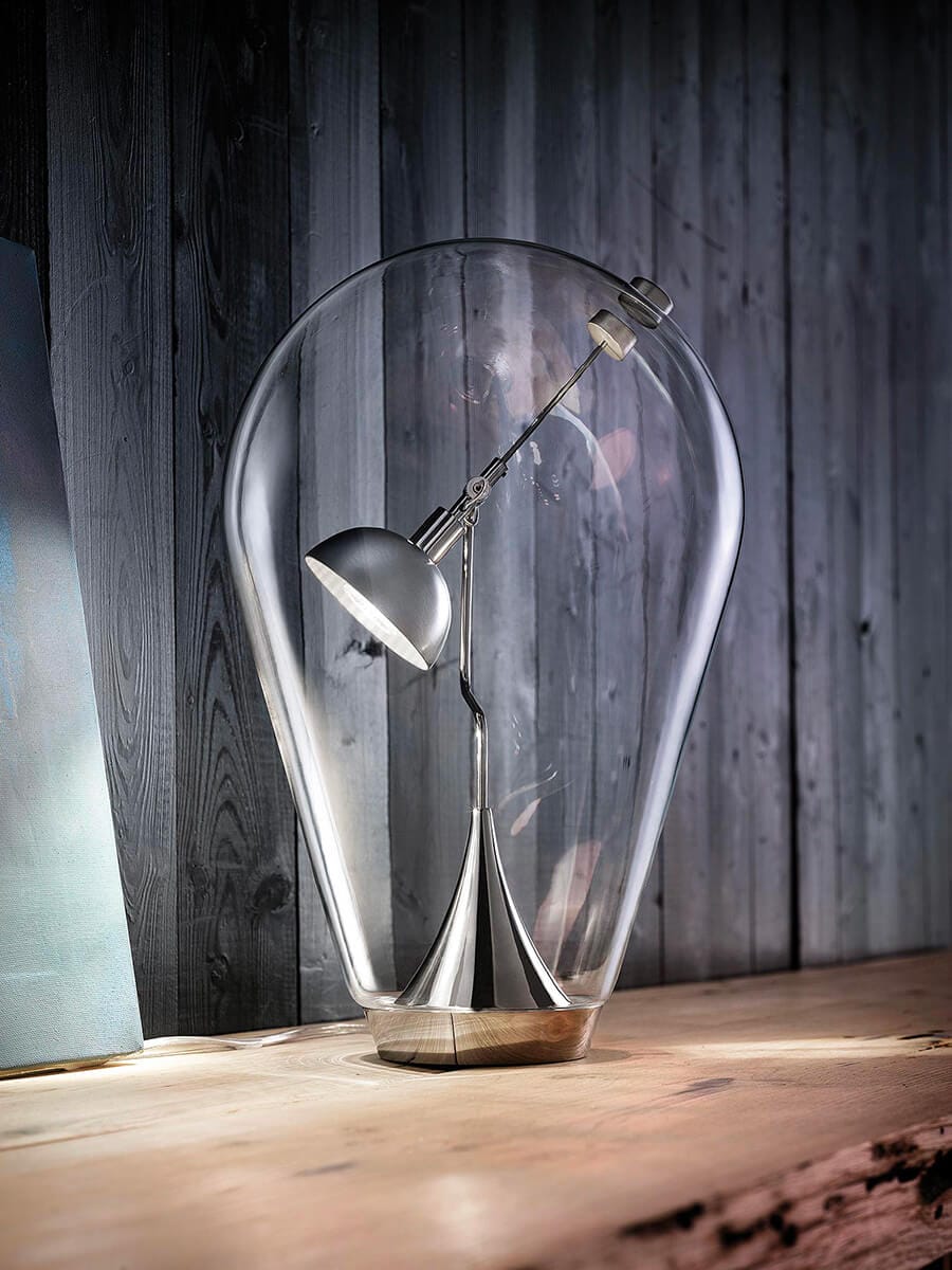 Podobnie jak przezroczysta, unosząca się bańka, Blow jest wynikiem właśnie dmuchania, stając się elegancką lampą stołową z kierunkowym światłem. Zaprojektowany przez Pio e Tito Toso, jest wykonana z dmuchanego szkła, oferując poetyckie piękno w swojej miękkiej formie, wzmocnionej wewnętrznym światłem LED. Chromowana metalowa podstawa o średnicy 10 cm podtrzymuje ruchome ramię, na którym zamocowane jest źródło światła, którym można dowolnie kierować przesuwając magnes na zewnątrz klosza.