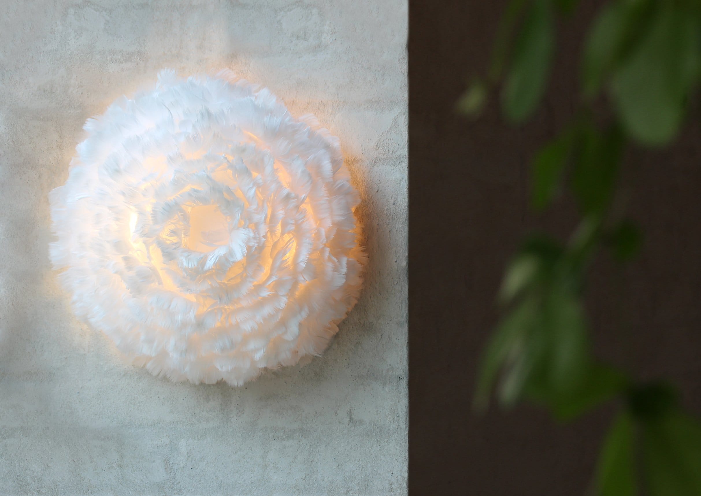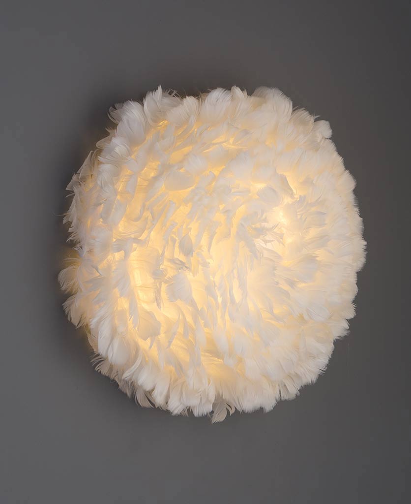 Kinkiet EOS UP duńskiej firmy Umage to wyjątkowe zjawisko wśród kinkietów. Zawdzięcza to niezwykłemu kloszowi przypominającemu nieprawdopodobną, zwieszoną w przestrzeni pierzastą chmurkę. Jednocześnie nie ma żadnych przeciwwskazań, by umieścić go na suficie w formie plafonu.