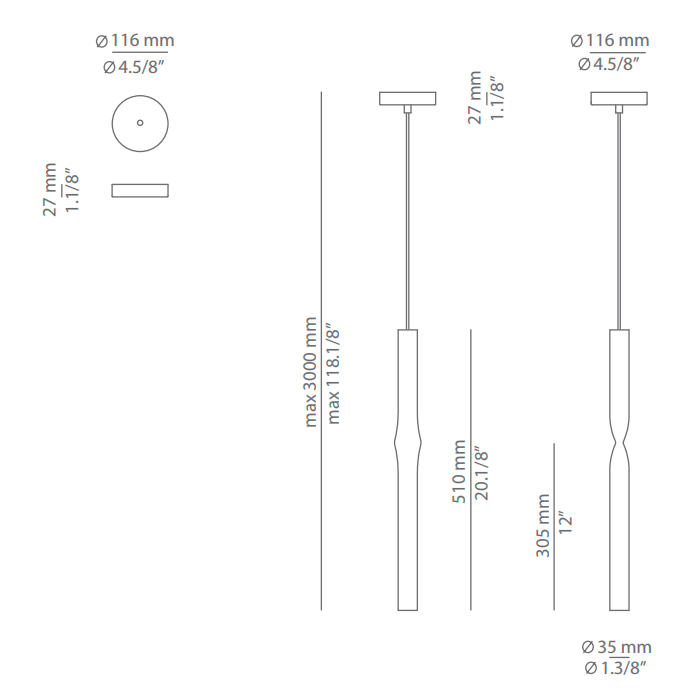 Metalowa lampa wisząca dostępna w trzech rozmiarach. Najdłuższa z nich której klosz o długości 51cm wykonany jest ze zgniecionej po środku metalowej tuby i akrylowej soczewki ze zintegrowaną diodą LED. Regulowana wysokość daje możliwość tworzenia kompozycji. Idealna do salonu, jadalni, sypialni, baru i restauracji, recepcji, wyspy kuchennej i lady.
