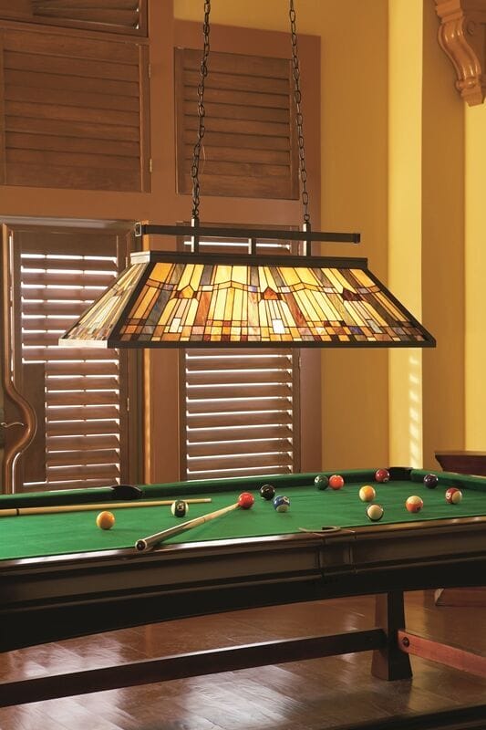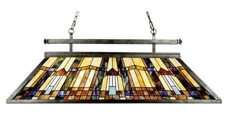 Styl Arts and Crafts ma piramidalny odcień ze schodkową ramką, która zwiększa zainteresowanie wizualne. Klasyczny geometryczny wzór obejmuje szkło artystyczne w odcieniach bursztynu, kremu i brązu, akcentowane kawałkami szkła w szafirowym błękicie i bogatej zieleni. Liniowe geometryczne detale na podstawie sprawiają, że jest to idealne uzupełnienie cienia.