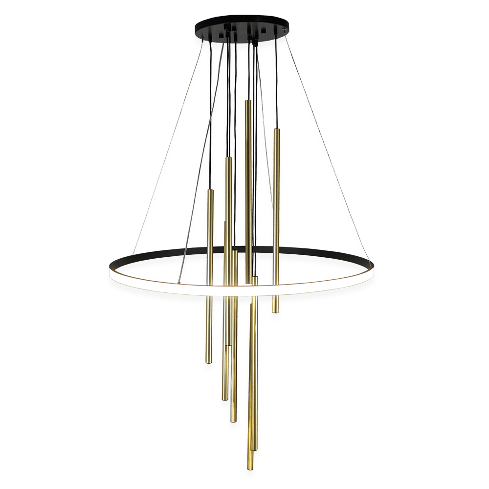 Złoty żyrandol LUNA firmy Antigo ( Amplex) składa się z 8 pojedynczych tubek w kolorze złotym, zestawionych na okrągłej podstawie o średnicy 32cm, z okalającą je ledową obręczą. Obręćz może świecić do wewnątrz lub na zewnątrz- w zalezności od wyboru. Wysokość całkowita to 200cm, W żyrandolu zastosowano gwint G9 na źródło światła o maksymalnej mocy 3W oraz taśmę LED COB