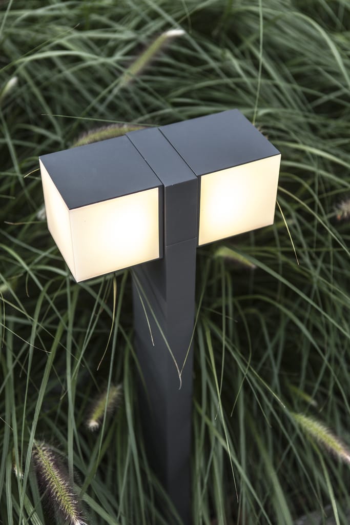 Zewnętrzna lampa stojąca CUBA chińskiej firmy Lutec to przykład bardzo wyważonego związku między konkurencyjnymi kosztami, a przemyślanym wzorem.