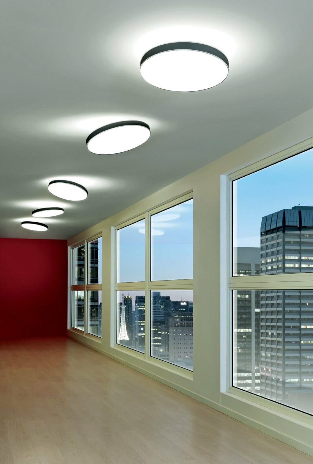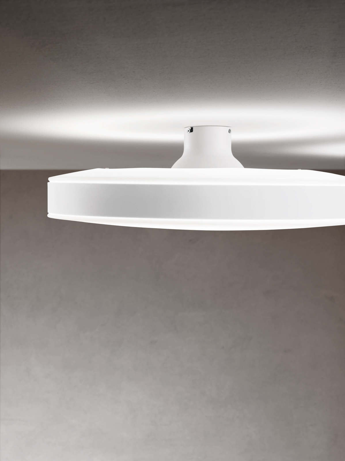 Lampa sufitowa MOVE S firmy Linea Light jest dużym, 54 centymetrowej średnicy okrągłym plafonem umocowanym do sufitu na krótkiej nóżce, niby odwrócony liść Wiktorii Królewskiej z przycięta łodyżką.