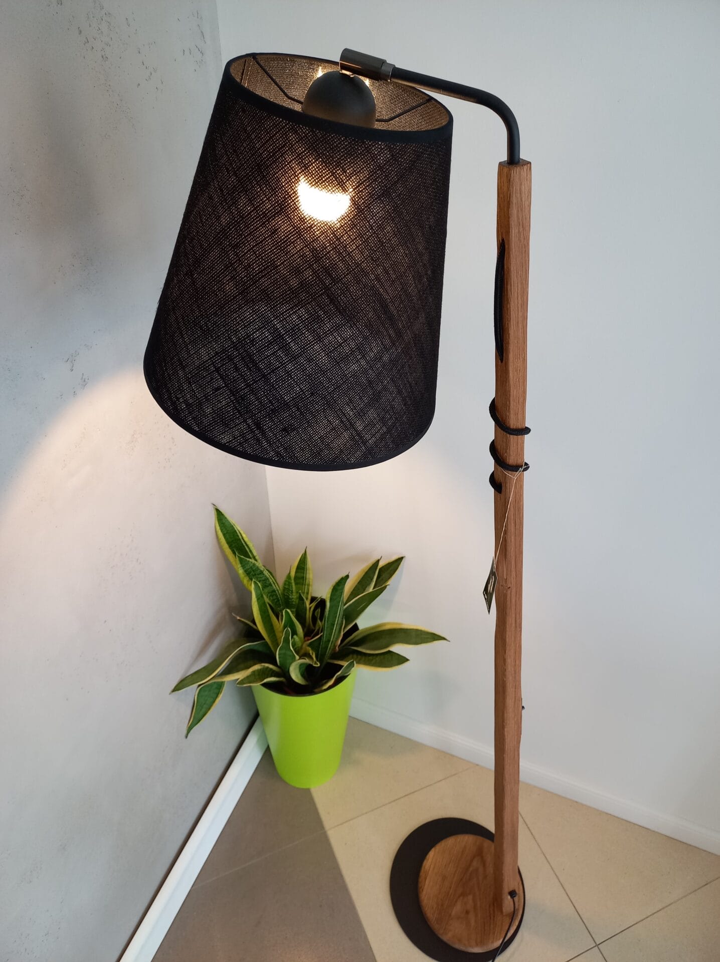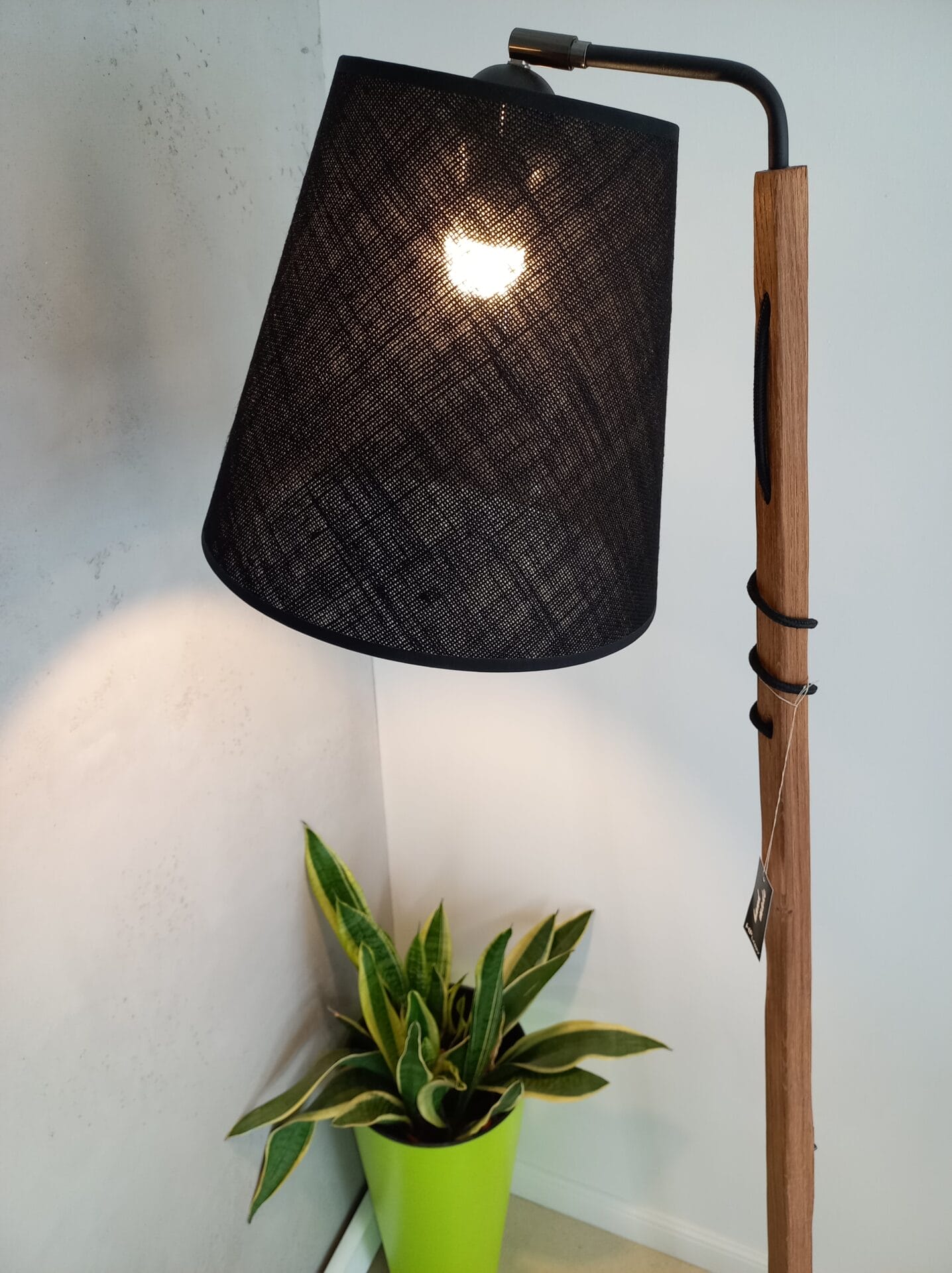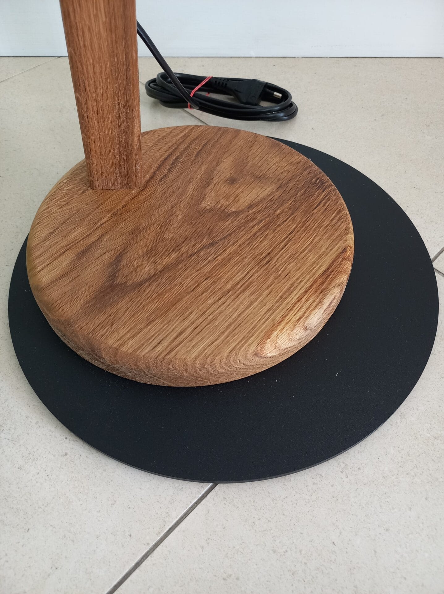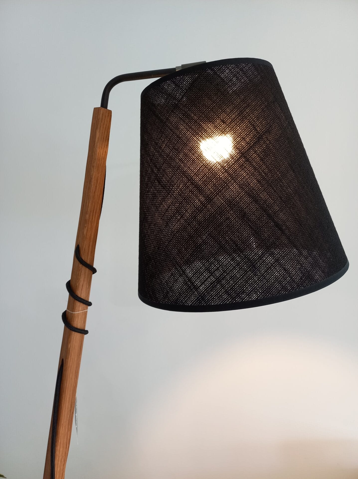 | Materiał | Metal, drewno dębowe, abażur wg wzornika ( na zdjęciu len czarny) |