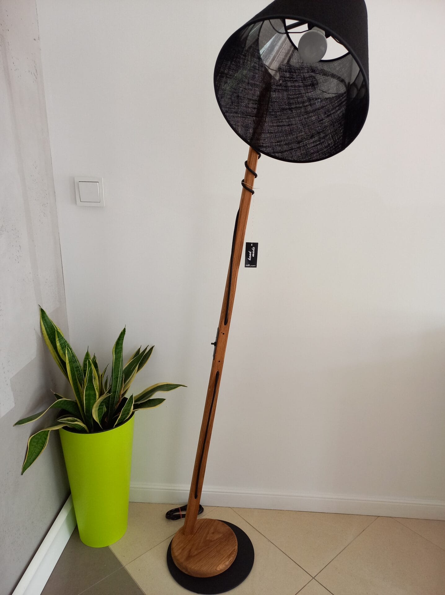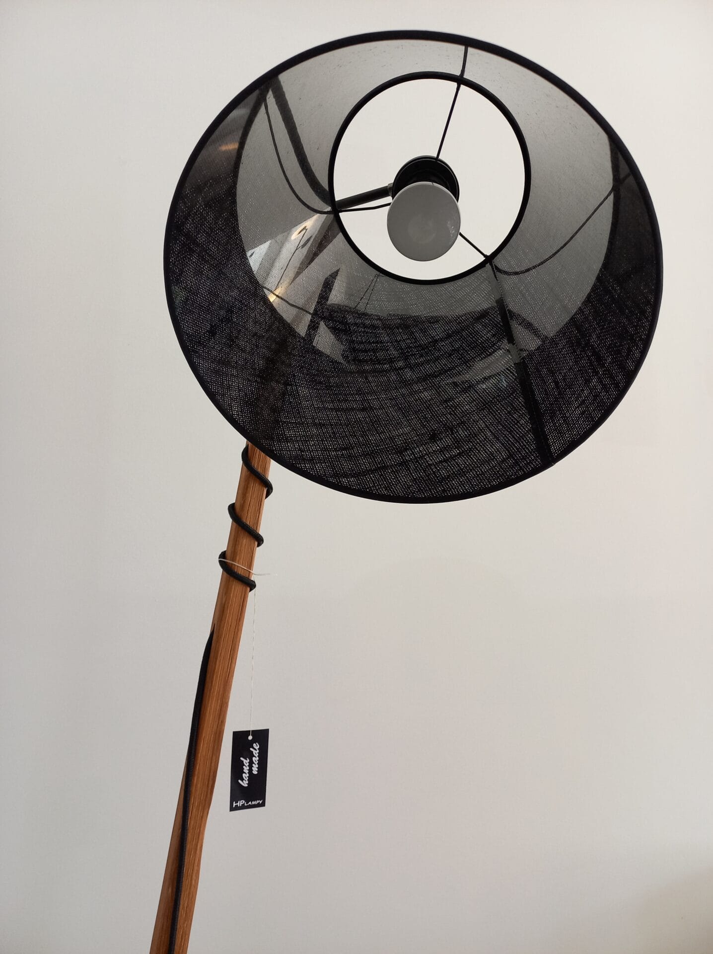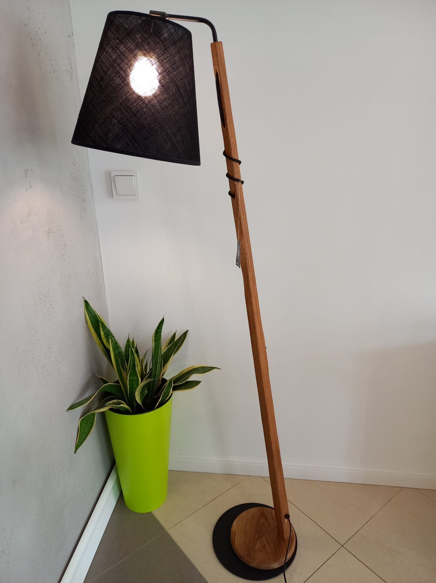 | Materiał | Metal, drewno dębowe, abażur wg wzornika ( na zdjęciu len czarny) |